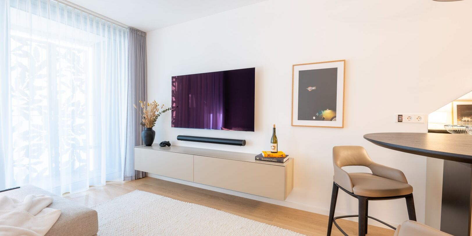 Im vierten Obergeschoß gelegen, zeichnet sich diese Wohnung durch ihre einzigartige und komfortable Anordnung aus. In den hellen und ruhigen Innenhof ausgerichtet, gibt es zwei Zimmer mit großzügigen Fensterflächen. Das Schlafzimmer ist möbliert (ein neues Hotelbett der Hotelkette SOFITEL, nicht am Foto abgebildet, bezogen im POLIFORM-Stoff des Sofas im Wohnzimmer ist im Preis inbegriffen), die Wand hinter dem Bett indirekt beleuchtet.