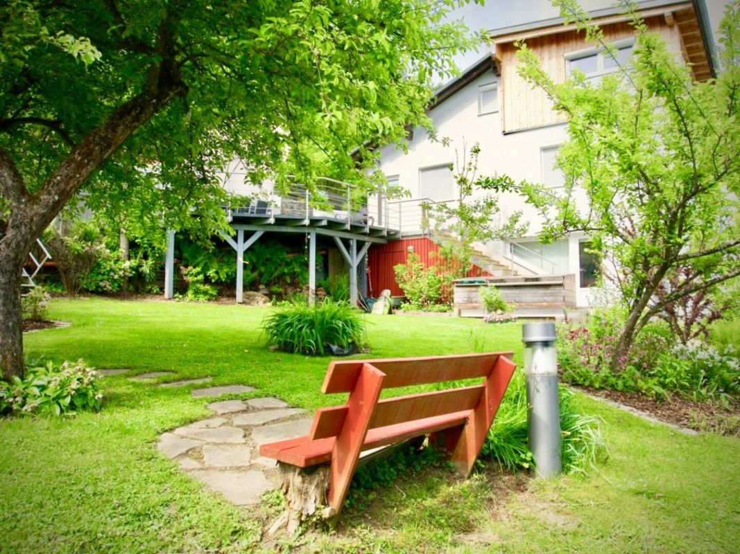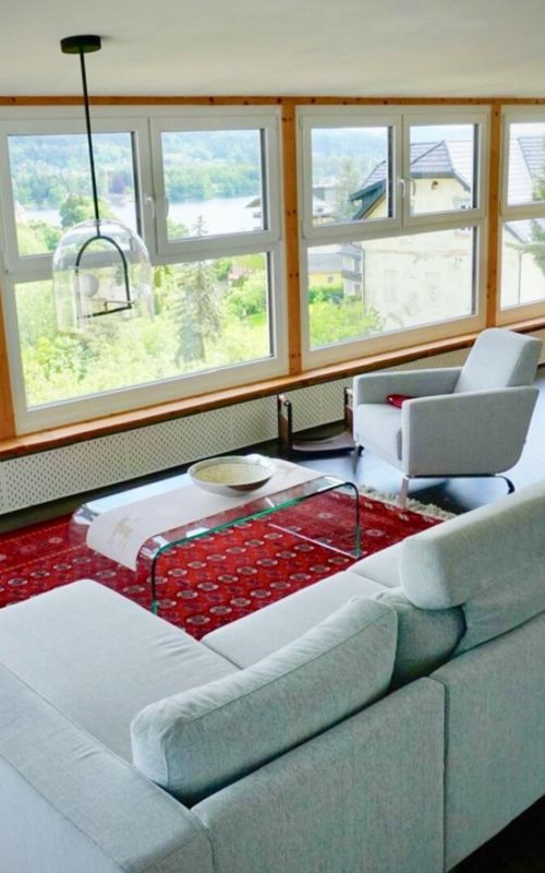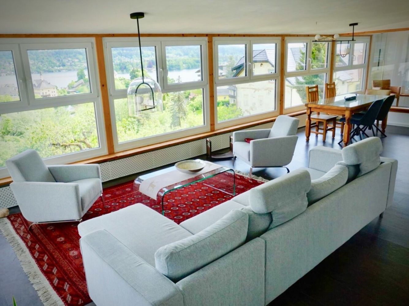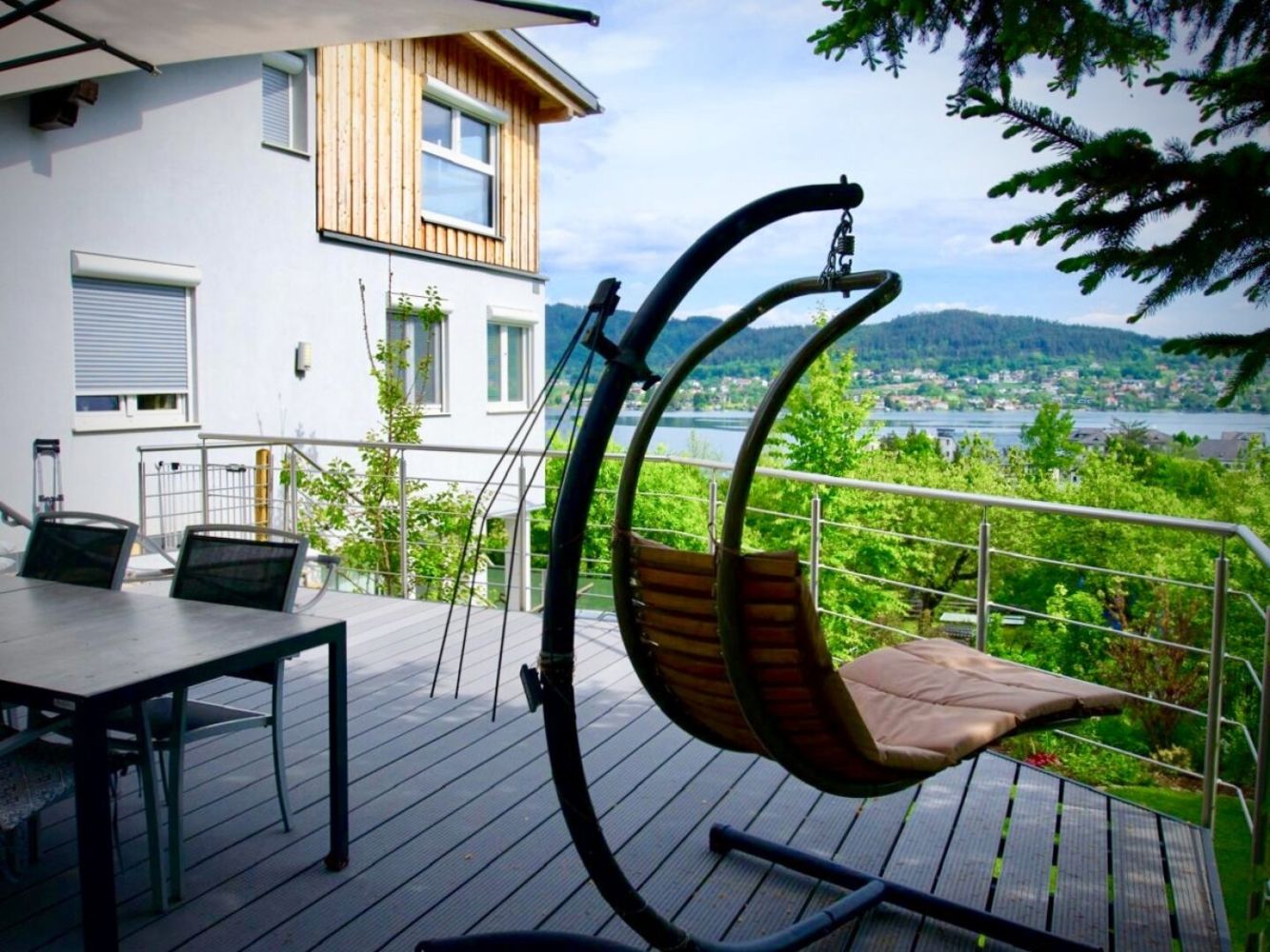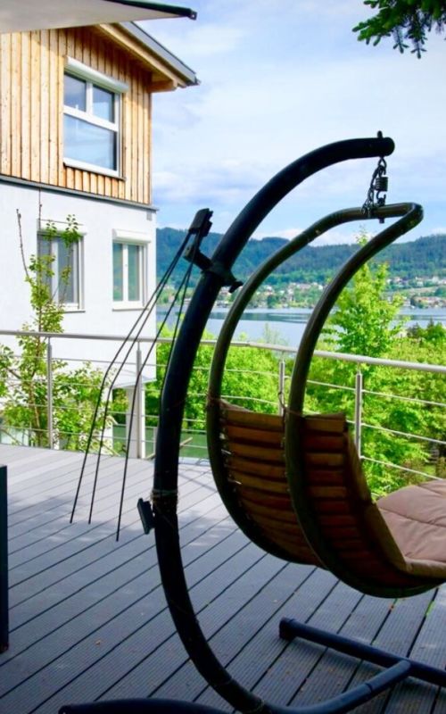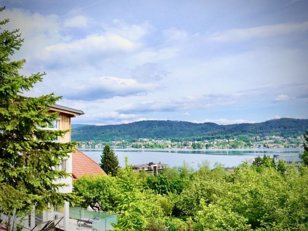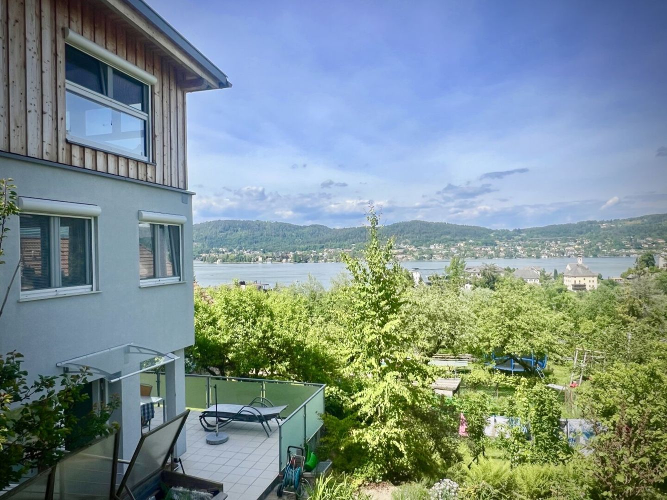 Auf 3 Ebenen, welche auch separat betreten und genutzt werden können, blickt man von den Terrassen in den ruhigen Garten mit schönem Baumbestand über Maria Wörth auf den See.