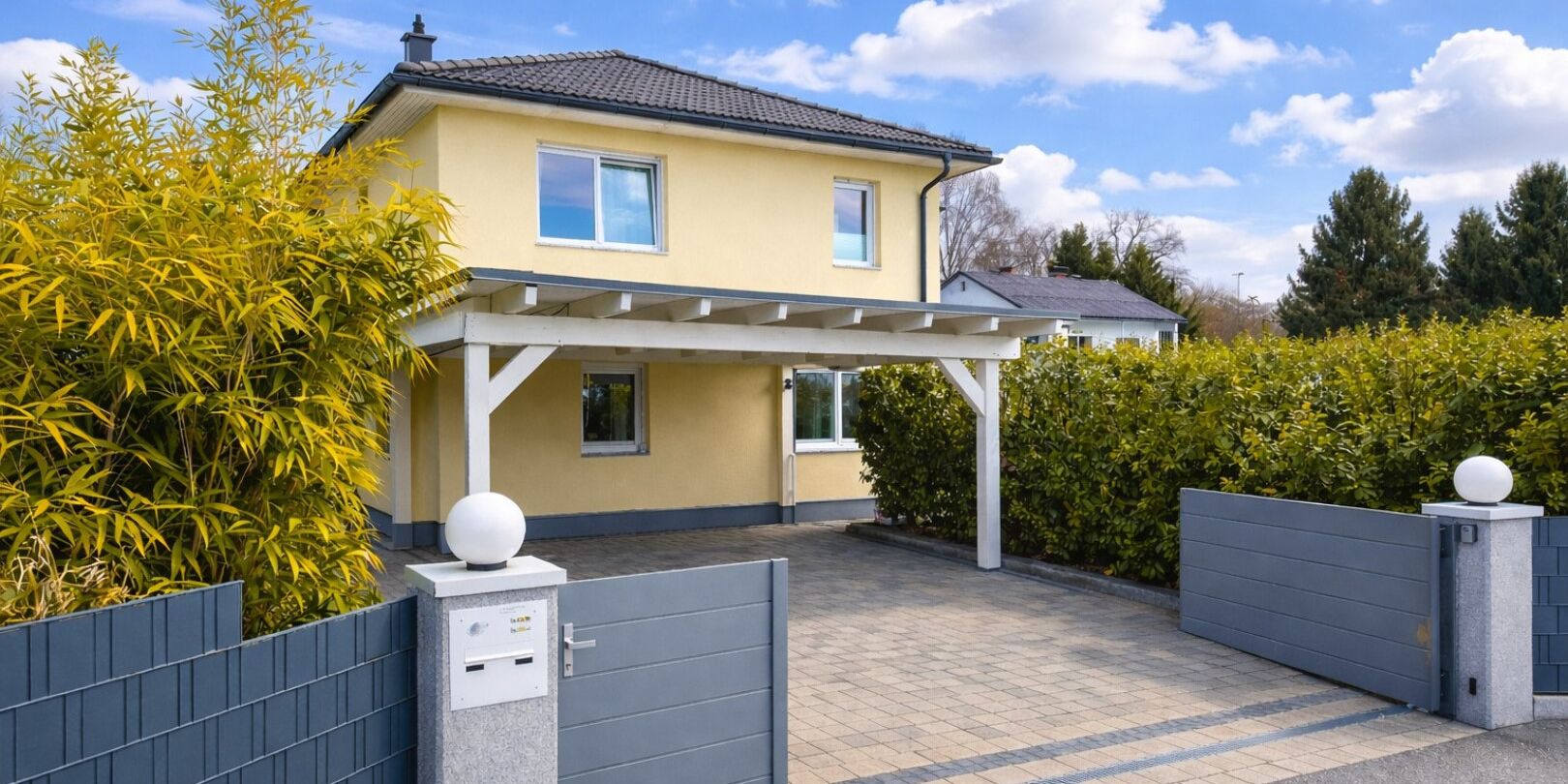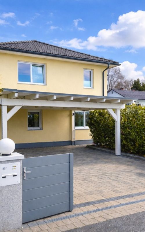 Das Doppelcarport vor dem Haus rundet das Angebot ab und sorgt dafür, dass Sie immer bequem und trocken parken können.